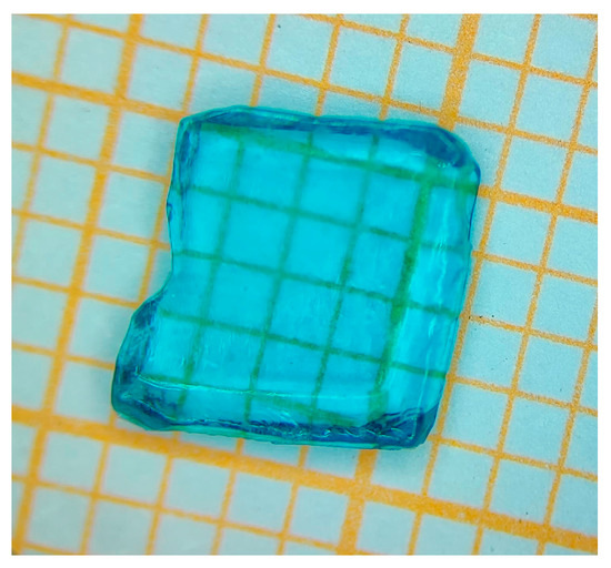 After 21 days, translucent single crystals with a light blue coloration, prismatic morphology, and average dimensions of 0.52 × 0.50 × 0.33 cm3 (L × W × H) were successfully obtained, as shown in Figure 1. For comparison purposes, individual crystals were also grown using the same methodology described from equimolar solutions (1:1 molar ratio) of 0.8455 g NiSO4(H2O)7—0.5281 g K2SO4 producing the K2Ni(SO4)2(H2O)6 crystal and 0.8453 g NiSO4(H2O)7—0.4279 g Na2SO4 forming the Na2Ni(SO4)2(H2O)4 crystal.