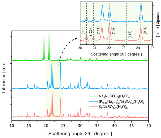 PXRD patterns of Na2Ni(SO4)2(H2O)4, (K0.86Na0.14)2Ni(SO4)2(H2O)6 and K2Ni(SO4)2(H2O)6 powder crystals. The inset shows in detail the 2θ angular region between 20 and 25°.