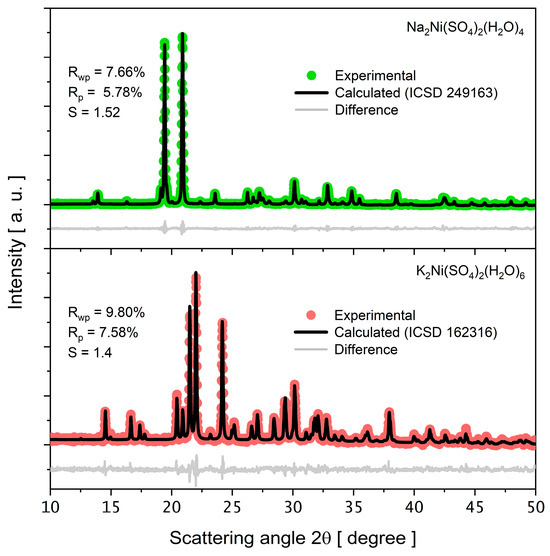A further structural investigation was performed on the individual phase patterns Na2Ni(SO4)2(H2O)4 and K2Ni(SO4)2(H2O)6 using the Rietveld refinement and CIF files (249163) and (162316) from the ICSD database, as shown in Figure 4. The idea was to evaluate the impact of introducing Na on the lattice parameters.