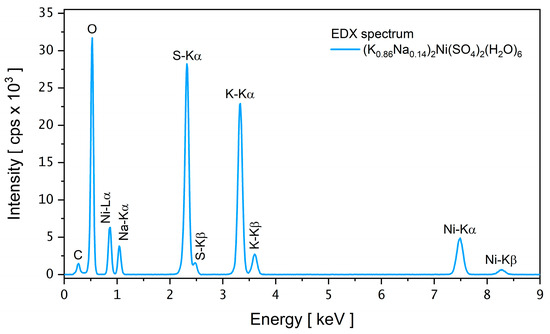 The semiquantitative compositional analysis by EDX spectroscopy, shown in Figure 5, confirmed the K, Na, S, Ni, and O elements as crystal constituents. Hydrogen was not detected due to its lower atomic weight and the reduced sensitivity of the method for this element. The signal at 0.275 keV (C peak) originated from the carbon tape used as a holder. The elemental evaluation indicated a K0.86/Na0.14 stoichiometric ratio. Therefore, the crystal did not achieve the nominal 0.5:0.5 ratio between the monovalent cations established in the syntheses. The missing elements remained in the mother solution.
