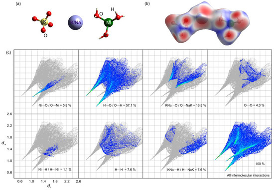 (a) Asymmetric units of the (K0.86Na0.14)2Ni(SO4)2(H2O)6 crystal. (b) Hirshfeld surface mapping according to dnorm. (c) Two-dimensional fingerprint plots decomposed into stratified histograms.