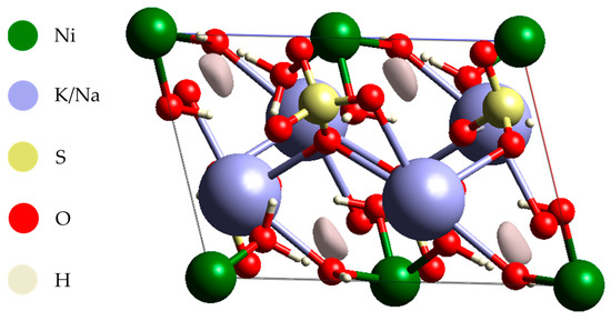 The preference for crystallization in the K2Ni(SO4)2(H2O)6 phase is supposedly associated with the atomic radii of the alkali metals, Na (2.27 Å) and K (2.75 Å), as the Na atom has a smaller atomic radius than the K atom by about 0.48 Å. This favors the formation of monoclinic structures in the crystal reticule involving SO4 and H2O groups, as observed in other studies [2,9,28].