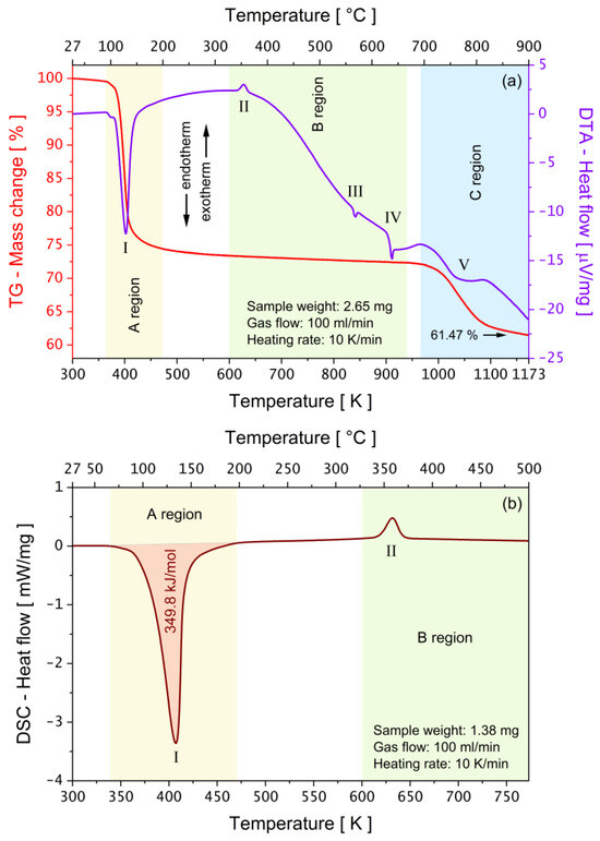 On the highlighted region endothermal peak I, ΔHdeh was about 349.8 kJ/mol—estimated using TA-60WS (version 2.2) software. The ΔHdeh value was comparable to 342 kJ/mol in K2Ni(SO4)2(H2O)6 [30].