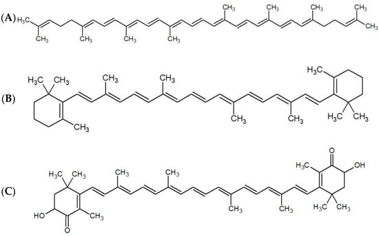 Chemical structures: (A) lycopene, (B) β-carotene, and (C) astaxanthin.
