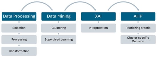 Next, studies on the Analytic Hierarchical Process (AHP) in customer service decision making are reviewed, showing how AHP helps prioritize actions and resource allocation based on specific criteria within each customer segment. Finally, the review includes the author’s previous research on RFID and related studies, demonstrating how this previous work aligns with and extends the current literature through the integration of clustering, XAI, and the AHP, thus highlighting the unique contributions of the proposed methodology.