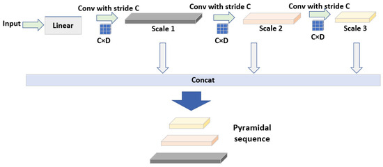 Structure of pyramid construction module. The input data are first dimensionally reduced through a linear layer, then processed through multiple convolutional layers to obtain sequences at different scales, and finally, the sequences at different scales are concatenated to form a pyramid structure.