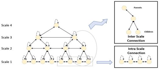In order to realize the capture of temporal dependencies for different scales, the PPT also introduces the PIM, whose structure is shown in Figure 4. After constructing a C-arys tree of the input sequence using PCM, within PIM, the pyramidal graph is divided into Inter-Scale connections (Inter Scale) and Intra-Scale connections (Intra Scale), as shown in Equation (8).