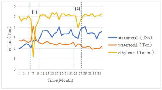 As shown in Figure 7, the three variables in the graph, steamtotal, fueltotal, and ethylene, are overall positively correlated. However, steamtotal and ethylene show negative correlation in time (1) and positive correlation in time (2). This reflects the complex interactions for different variables in the ethylene production process. Therefore, in order to extract the multivariate characteristics of the ethylene production process, the MPPT is proposed to construct the interaction relationship between different variables.