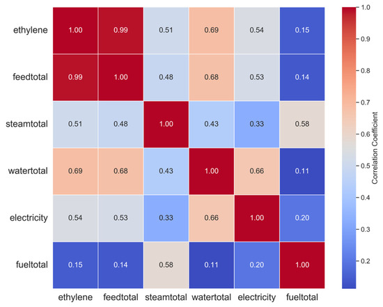 To further demonstrate the importance of multigranularity modeling, we also calculated the feature correlations at granularity 1 and granularity 2 using the Pearson correlation coefficient. The correlation heatmaps are shown in Figure 8 and Figure 9. A higher correlation between two variables indicates a stronger association between them. As can be seen in Figure 8 and Figure 9, the input and output variables exhibit overall correlations. However, the degree of correlation between variables varies across different granularities. Under granularity 1, the correlation between ethylene and feedtotal and watertotal is more significant, reaching 0.99 and 0.78, respectively. In granularity 2, the correlation between ethylene and feedtotal and steamtotal is more significant, reaching 0.77 and 0.69, respectively. This indicates that the correlations between variables change at different time granularities, and modeling only single-granularity data may overlook some important features. Therefore, integrating data from multiple time granularities can help to reveal the diversity of data and the complex relationships between variables at different granularities. Overall, the comparative experiments on sample entropy and correlation at the two time- granularities fully demonstrate the necessity of multigranularity modeling. Modeling multigranularity data not only enables the extraction of interaction features between different input variables but also captures a more comprehensive feature representation between the inputs and outputs. Moreover, modeling multigranularity data and integrating correlation changes at different time granularities can enhance the model’s robustness. This improves both the accuracy and adaptability of predictions.