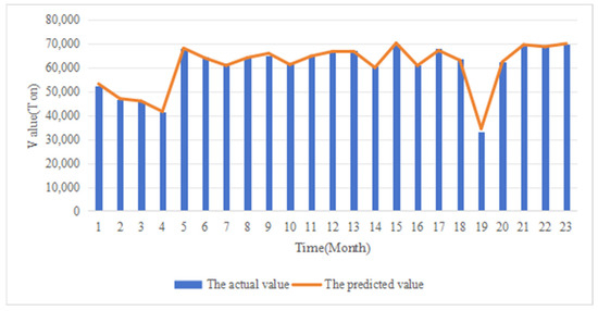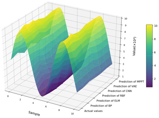 In order to verify the validity and reliability of MPPT, we used ethylene production as the output. The ethylene dataset was divided into a training set, a test set, and a validation set in the ratio of 8:1:1. The training set, validation set, and test set are used to train the model, tune the model parameters, and evaluate the predictive performance of the model, respectively. The model experiments were performed using Adam optimizer with learning rate set to 3 × 10−4 and batch size set to 32. The results of each model on the test set are shown in Table 3. The prediction results of MPPT with other models are shown in Figure 10. It can be observed that the curve of the MPPT prediction results is the most similar to the actual values. To further clearly demonstrate the accuracy of the MPPT predictions, we compared the MPPT prediction results with the actual values, as shown in Figure 11.