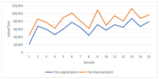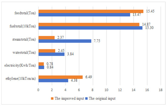 Using the eighth sample point in Figure 12 as an example, the comparison of production inputs before and after optimization of the ethylene production unit is shown in Figure 13. Compared with the original material consumption, the material consumption of the ethylene production unit after optimization, fueltotal, steamtotal, watertotal, and electricity decreased by 0.43 × 104 tons, 5.38 tons, 1.386 tons, and 0.059 kWh/ton, respectively. Feedtotal increased by 1.9823 tons. After the production input optimization, the ethylene production increased by 2.1134 × 104 tons. Using the MPPT model, we predicted ethylene production under different plant inputs. The MPPT can achieve energy savings, and reduced emissions, which demonstrated superiority of MPPT in energy efficiency optimization. Meanwhile, the improved plant will reduce CO2 emissions by 5833 tons.