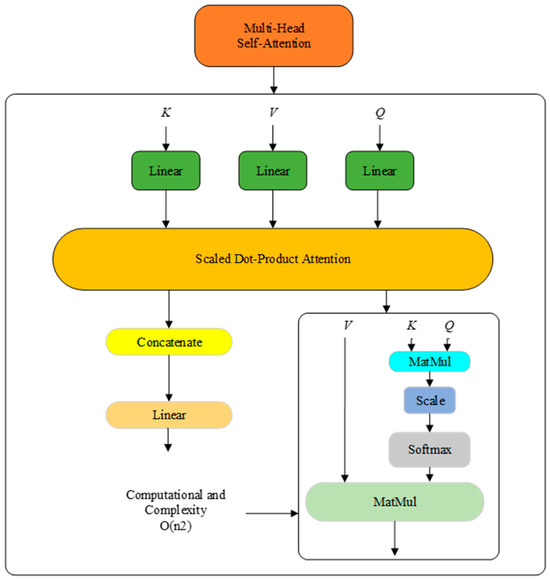 Multi-head attention is a variant of the attention mechanism commonly used in neural networks, whose main purpose is to improve the model’s representation of input sequences by simultaneously considering different representation subspaces. [30]. Multi-head attention is a repetition of scaled dot-product attention for z times, and then the results obtained from z times of scaled dot-product attention are combined, and Q, K, and V are linearly transformed with a different parameter W each time, as shown in Equation (2). Then, another linear transformation is performed, at which point the value obtained is the value of multi-head attention, as shown in Equation (3). The multi-head attention derived from the aforementioned computation enables the model to acquire pertinent information across various representational dimensions. Figure 2 shows the framework for multi-headed attention.