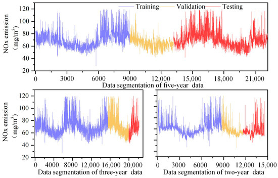 Heysem et al. [16] used the first three years of data for training and validation and the last two years for testing to ensure repeatability and comparability of the work. To demonstrate the predictive effect of the prediction model more clearly, this paper considers whether to extract some of the data for prediction presentation. Kochueva and Nikolskii [40] examine the possibility of treating the entire five-year dataset as a unified training set to develop a single model or determining whether it is essential to partition the data based on either the year or the season. In the paper, the authors mention that the median NOx emissions in 2014 and 2015 were 10% lower than in 2011–2013. To validate the viability of the proposed model in this study, the data can be split into two subsets. One subset includes the 2011–2013 dataset, and the second subset includes the 2014–2015 dataset.