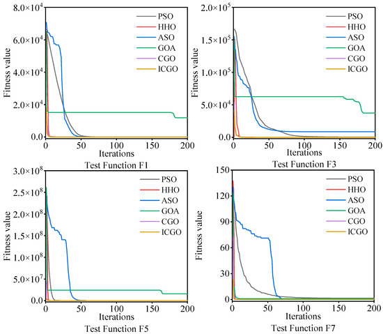 The ICGO algorithm is evaluated on four test functions and compared with Particle Swarm Optimization (PSO), Harris Hawk Optimization (HHO), Atomic Search Optimization (ASO), Grasshopper Optimization Algorithm (GOA), and Chaotic Game Optimization (CGO). To ensure a fair comparison, all algorithms are set to the same number of iterations (200) and population size (30), with other parameters kept at their default values. Figure 6 presents the convergence curves of the six optimization algorithms on several benchmark test functions, providing a clear visualization of their optimization performance. The results clearly demonstrate that the ICGO algorithm achieves the fastest convergence speed.
