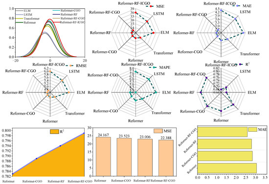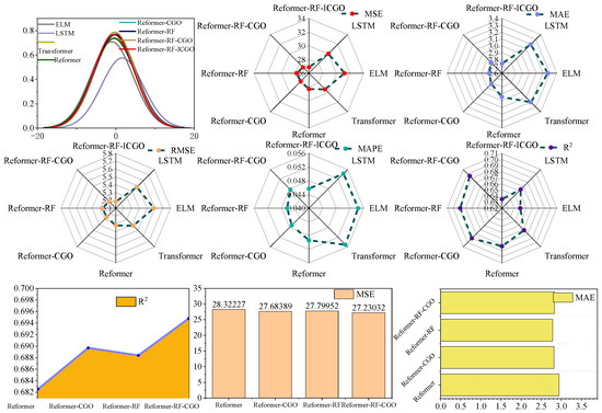 Secondly, for the second and third datasets, Reformer, Reformer-CGO, Reformer-RF-CGO, and Reformer-RF-ICGO were compared. In the second dataset, compared to Reformer, MSE, RMSE, and MAE, MAPE for Reformer-CGO decreased by 1.4056 mg/m3, 0.1542 mg/m3, 0.1463 mg/m3, 0.2% and R2 increased by 0.0162, respectively. Compared to Reformer-RF-CGO, MSE, RMSE, MAE, MAPE for Reformer-RF-ICGO decreased by 0.2303 mg/m3, 0.051 mg/m3, 0.0244 mg/m3, 0.08%, and R2 increased by 0.0023, respectively. In the third dataset, compared to Reformer, MSE, RMSE, MAE, MAPE for Reformer-CGO decreased by 0.6384 mg/m3, 0.1283 mg/m3, 0.0604 mg/m3, 0.23%, respectively, and R2 increased by 0.0072. Compared to Reformer-RF-CGO MSE, RMSE, MAE, MAPE for Reformer-RF-ICGO decreased by 0.3469 mg/m3, 0.0884 mg/m3, 0.0334 mg/m3, 0.2%, and R2 increased by 0.039, respectively. Meanwhile, radar plots, line plots, and histograms of the predictors in Figure 10 and Figure 11 clearly show that the algorithm-optimized model significantly outperforms the unoptimized model in predicting NOx, which indicates that ICGO can effectively find the optimal hyper-parameters.