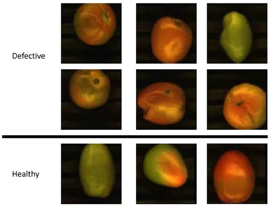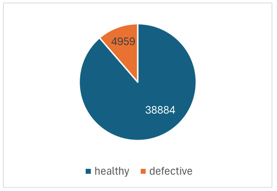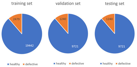 The dataset used in this study is obtained from a previous research study [37]. It consists of 43,843 colored images of tomatoes, collected over two months from the Fomesa tomato sorting and grading machine at a business facility in Campinas, Brazil. Each image is 100 by 100 pixels with three color channels (RGB). This dataset is relatively large compared to those used in most previous related studies and is, to the best of our knowledge, the largest publicly available tomato dataset with two classes: healthy and defective. Defective class includes tomatoes with various defects such as cuts, dark spots, rain bruises, small and deformed shapes, punctures, rain spots, large and dark peduncles, or an unpleasant appearance. Healthy class includes tomatoes that are suitable for the consumer market. Figure 2 shows examples of both defective and healthy tomatoes from the dataset. The distribution of the whole dataset is depicted in Figure 3. Unfortunately, the dataset is extremely imbalanced, as it has only 4959 images of defective tomatoes compared to 38,884 images of healthy tomatoes. The researchers who collected the dataset organized it into three sets: training, validation, and testing, where the training set constitutes 50% of the dataset and each of the validation and testing sets forms 25% of the dataset. The class distribution in each set, as seen in Figure 4, is relatively similar to the class distribution in the whole dataset.