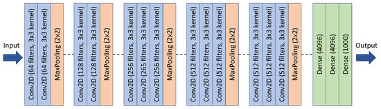 VGG16, developed by the Visual Geometry Group (VGG) at the University of Oxford [44], consists of 16 layers (including convolutional, pooling, and fully connected (dense) layers) and approximately 138 million parameters. A simplified architecture of VGG16 is given in Figure 5. In this study, VGG16 is employed as a feature extractor without fine-tuning, where the fully connected layers (i.e., the last three dense layers) are removed to obtain deep representations of the tomato images.