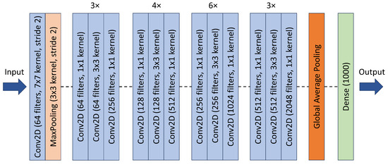 ResNet-50, developed by Kaiming He et al. [45], consists of 50 layers (including convolutional, pooling, and fully connected layers) and approximately 25.6 million parameters. ResNet-50 uses deep residual learning to address the vanishing gradient problem that occurs in very deep CNN architectures. Figure 6 presents a simplified architecture of ResNet-50. Similar to VGG16, ResNet-50 is used in this study as a feature extractor without fine-tuning, where the fully connected layer is removed (i.e., the last dense layer) to extract complementary deep representations of the tomato images.