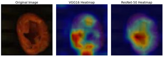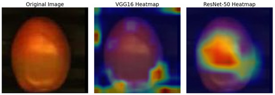 Figure 7 shows a healthy tomato image with its Grad-CAM (Gradient-weighted Class Activation Mapping) heatmaps overlaid on the original image, highlighting the regions most relevant to the “healthy” class. Similarly, Figure 8 presents a defective tomato image with Grad-CAM heatmaps, revealing the areas most relevant to the “defective” class. These heatmaps were generated using the feature maps from the last convolutional layers of VGG16 and ResNet-50.
