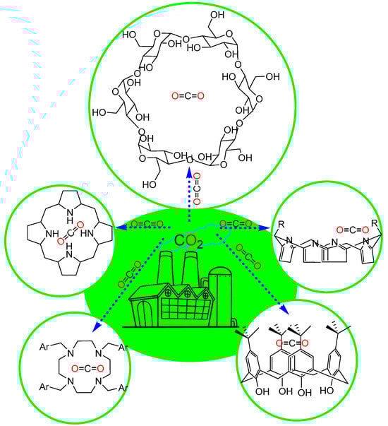 The supramolecular chemistry principles, such as the formation of host–guest complexes, have also been applied to improve carbon dioxide (CO2) retention capabilities. In fact, relevant results have already been obtained on the encapsulation and complexation of CO2 by using these macrocycles as a host. As examples, we can mention that β-cyclodextrin (β-CD) forms cyclodextrin-based nanosponges capable of capturing CO2 gas [39], and other modified CDs at their hydroxyl groups (e.g., the primary face of β-CD was functionalized with an amino group showing excellent CO2/N2 adsorption) [40].