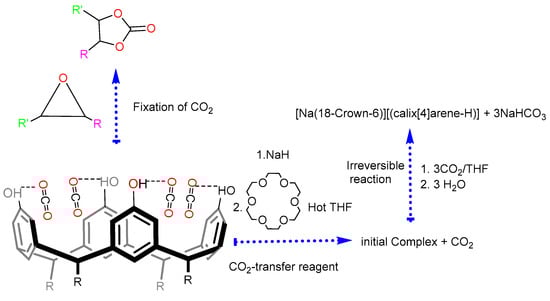 A first example of the use of these platforms in the fixation and transformation of CO2 is found in the work of Fisher et al. [62]. In this article, the authors show the reaction between tert-butylcalix[4]arene and crown ethers to form a complex macrocyclic system, characterized by presenting an Na6O6 skeleton consisting of two fused open heterocubanes. Two Na+ ions are encapsulated in the cavities of the calix[4]arene units. An interesting aspect presented by some of these systems is related to their capacity to absorb carbon dioxide in THF, and they are active reagents for transferring CO2 to 2-fluoropropiophenone. The authors highlighted the importance of the subtle influence of the structure of the alkali metal complexes on the CO2 reactivity in these type of complexes. Hou et al. characterized and examined the use of tert-butylcalix[6]arene in the construction of polynuclear metal clusters, specifically in titanium-oxo clusters (TOCs). These authors highlight that this type of cluster exhibits a high carbon dioxide fixation capacity and a superior catalytic activity due to the presence of more metal catalytic sites. Finally, the article highlights the importance of the use of tert-butylcalix[6]arene in the flexibility, stability and high nuclearity of TOCs [63].