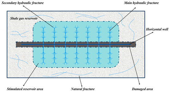Figure 1. During shale gas reservoir exploitation, three conductivity media can form in shale gas reservoirs, including unstimulated, stimulated, and damaged areas, depending on different development processes and transformation methods. In addition to natural fractures, main, secondary, and micro-hydraulic fractures tend to occur after hydraulic fracturing. In this study, micro-fractures are treated as secondary fractures, and their conductivity is assumed to be consistent. The reason for this assumption is that the conductivity of secondary fractures is close to that of micro-fractures; by comparison, a pronounced difference in conductivity exists between main and secondary hydraulic fractures [