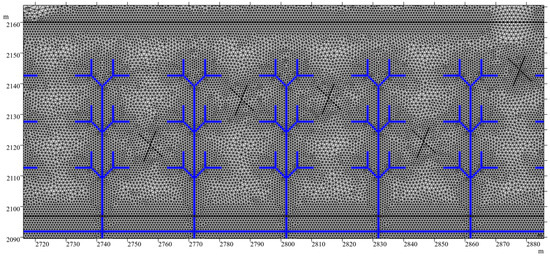 Mesh refinement was carried out for the main hydraulic fracture, secondary fracture, and the area surrounding the horizontal well. Specifically, meshing conditions consistent with the reconstruction and damaged areas were used; in contrast, the grid resolution was increased in narrow areas. The fundamental parameters for the grid refinement are presented in
