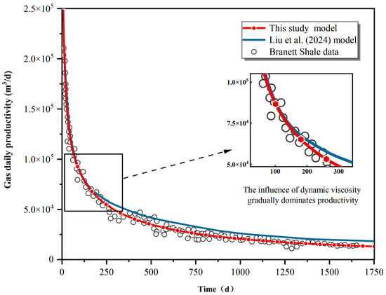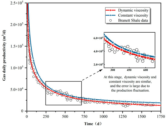 Figure 5 compares the daily productivity and dynamic viscosity in this study with the Barnett productivity and constant viscosity. The introduction of Lee’s correlation into the shale gas productivity model contributed to the consistency between the simulation results and the Barnett Shale data. The maximum and average errors were 9.316% and 5.902%, respectively, indicating high simulation accuracy. The gas viscosity is 2 × 10