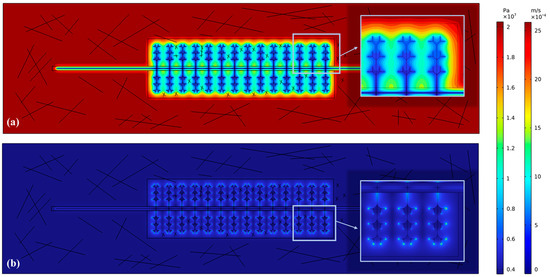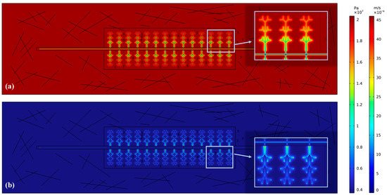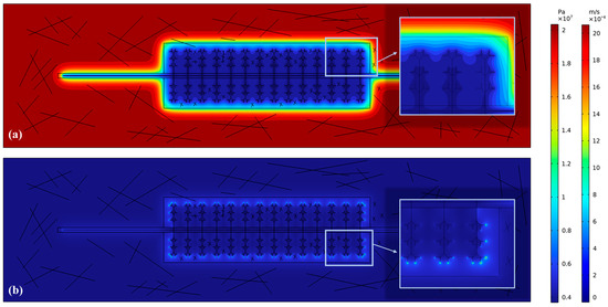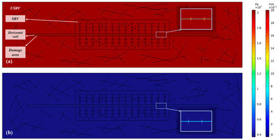Figure 8 shows the initial reservoir pressure and the shale gas flow on the 10th day. A large pressure drop has occurred near the hydraulic fracture, tending to decrease progressively with increasing distance from the horizontal well. This change shows that shale gas is mainly being exploited around the fracture. In addition, a closer fracture to the horizontal well experiences greater exploitation of the surrounding shale gas. This feature can also be identified using the Darcy velocity. Around the hydraulic fracture exhibiting a closer vicinity to the horizontal well, the inflow of shale gas is faster, and the productivity per unit time is greater. Notably, the damaged area restricts the fracture conductivity and the shale gas inflow in the reservoir. Consequently, fracture expansion is largely impeded in the damaged areas due to the limited conductivity and production range, greatly limiting shale gas productivity.