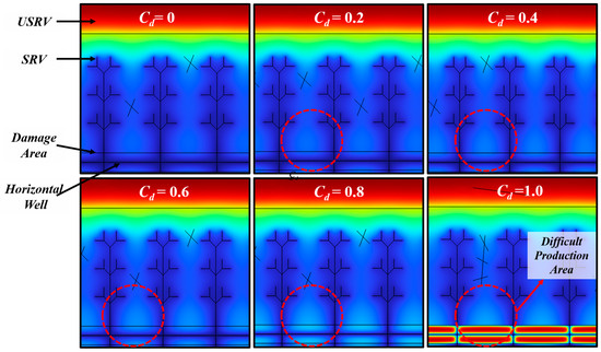 Figure 13. With the rising damage coefficient, a “difficult production area” of shale gas emerges in the damaged area. The conductivity of this region greatly influences local shale gas exploitation. Specifically, in the case of a low damage coefficient, the shale gas flowing into the horizontal well encounters low seepage resistance. Consequently, the shale gas in the “difficult production area” is fully exploited, contributing to high shale gas productivity. In contrast, when the damaged coefficient is excessively large, the stored shale gas needs to overcome considerable seepage resistance to flow into the horizontal well through the damaged area, resulting in low flowing rates. This largely decreases shale gas productivity. It is worth noting that when the damage coefficient is 1, the damaged area contains almost no shale gas flow, and no pressure drops occur in this zone. The exploitation of shale gas is blocked, and the productivity plummets. This phenomenon is a major source of pollution during the development of shale gas reservoirs.