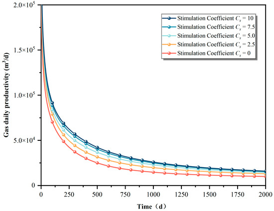 Figure 15 schematically presents the daily productivity of shale gas under different stimulation coefficients. The daily productivity of shale gas decreases rapidly with varying stimulation coefficients before the stable production period. With intensified stimulation in the SRV area, the daily productivity of shale gas increases. Notably, the degree of these increases is reduced with the rise in the stimulation coefficient. The change in stimulation coefficient mainly affects shale gas production in the middle and late stages.