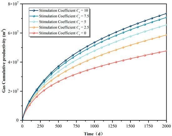 Figure 17 shows the changes in the cumulative shale gas productivity under varying stimulation coefficients. This trend is consistent with the change trend of the cumulative productivity under various damage coefficients. Specifically, the cumulative productivity increases rapidly in the early stage of production due to the high shale gas productivity at that stage. When the gas supply area expands, the seepage resistance increases, and the elevation in cumulative productivity slows down. With the coefficient rising from 0 to 2.5, the corresponding cumulative productivity increases by more than 25%. When it further increases from 2.5 to 5, the cumulative shale gas productivity undergoes a 13% increase. With another increase from 5 to 7.5, the growth in cumulative productivity is only slightly more than 5%. The effect of increasing the stimulation coefficient is reduced.