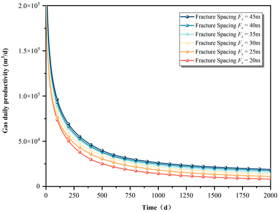 Figure 18 shows the daily shale gas productivity under different main fracture spacings. The daily shale gas productivity decreases rapidly and then stabilizes, consistent with the change trend of shale gas productivity in actual production. With the increase in fracture spacing, the daily shale gas production capacity also increases. Notably, as the spacing continues to expand, the increase in production capacity becomes much smaller.