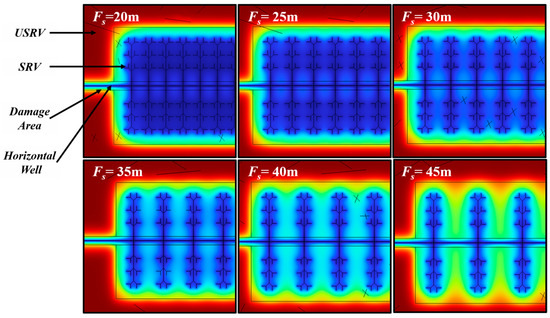 Figure 20. This change trend first evolves fast and then slows down. This tendency is consistent with that under the influence of the damage degree and stimulation intensity. In addition, it conforms to the change trend in real shale gas production. When the fracture spacing increases from 20 m to 25 m, the cumulative productivity increases by nearly 25%. With a further increase to 30 m, an approximately 15% enhancement in cumulative productivity is obtained. When the fracture spacing extends from 30 m to 35 m, the cumulative productivity experiences a relatively small increase of about 7%. In the case of 40 m spacing, the improvement in cumulative productivity is less than 5%.