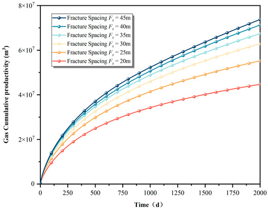 The cumulative change in shale gas productivity under conditions of different fracture spacings is presented in