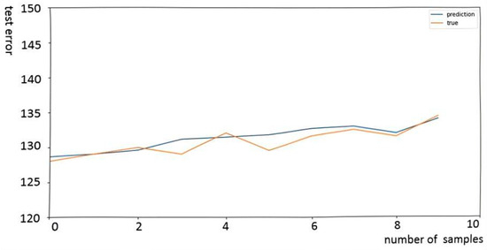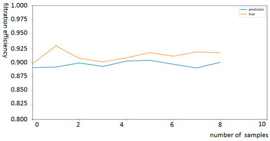 Using the same method as described in Section 5.2, data training was performed for the filtration efficiency of the intake filter. The total amount of data are 25 entries, with 16 entries used for training and 9 entries used for testing. The results are shown in Figure 10 and Figure 11. Figure 11 is a comparison curve of the actual values and predicted values of the filtration efficiency in the test set after training the LSTM neural network for filtration efficiency. It can be seen that, similar to the pressure drop data training of the intake filter, the LSTM neural network can effectively fit the changes in filtration efficiency with respect to environmental parameters. This provides a reference for the further engineering application of this method.