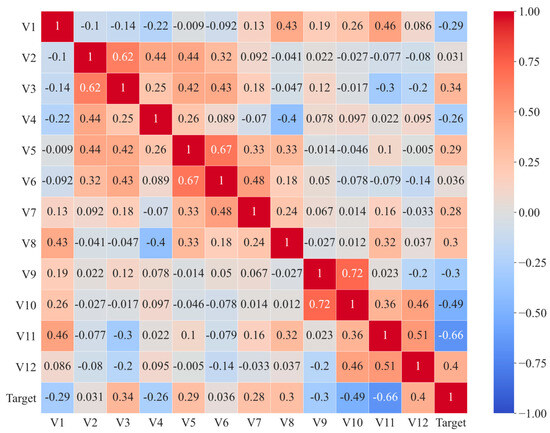 Figure 3 illustrates the correlations among the 13 variables. Table 1 displays V1 to V12, while Target represents the ESP energy consumption, serving as the prediction target for the energy consumption prediction model. The energy consumption of different ESP types varies significantly, mainly due to differences in their lifting capacities. So, it is essential to normalize the energy consumption across various types of ESPs to a standardized scale. This study defines ESP energy consumption as the electrical energy consumed to lift a unit volume of fluid, which can be calculated using the following equation: