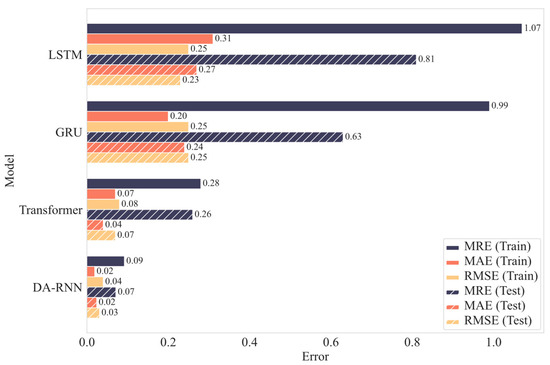 The performance of the deep learning model is evaluated based on the above three metrics, and the best-performing energy prediction model is selected. The results of the model performance comparison are shown in Figure 4. It can be seen that the DA-RNN model has the best prediction results for the training and test sets, and the MRE, MAE, and RMSE of the training and test sets are smaller. Therefore, DA-RNN is selected as the final energy consumption prediction model in this study.