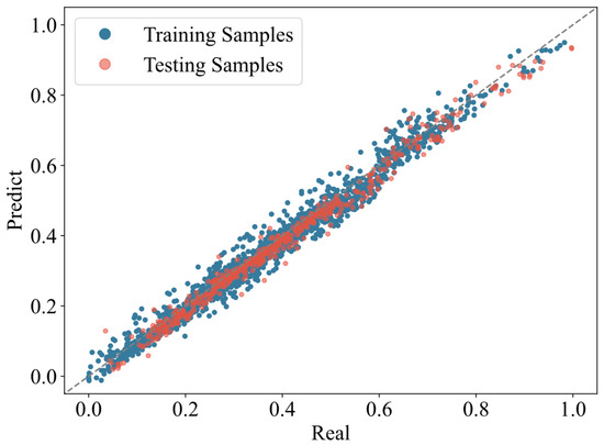 After fine-tuning the hyperparameters, the DA-RNN achieves high accuracy on both the training and test sets. The model’s predictions on the dataset are illustrated in Figure 5, where the horizontal axis represents real energy consumption, and the vertical axis shows predicted energy consumption. The clustering of sample points from the training and test sets around the diagonal in the figure indicates that the model’s predictions closely align with the actual observations.