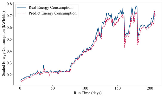 The DA-RNN-based ESP energy consumption prediction model accurately calculates the electrical energy consumption of ESPs. This model enables real-time online energy consumption calculation and lays the foundation for optimizing the ESP operation regime. The effect of energy consumption prediction for well A in the Bohai PL field is shown in Figure 7.