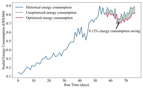 Following 55 days of operation, the operating regime for well B was optimized. Well B represents the well with the best optimization effect among the 42 wells analyzed during the study. In Figure 9, the solid blue line represents the historical energy consumption, while the red solid line represents the measured energy consumption after the optimization. The blue dashed line shows the energy consumption predicted by the model while maintaining the original operating regime. The green shading in the figure represents the percentage reduction in energy consumption. After the optimization, the energy consumption of well B decreased by 8.12%, which was the maximum energy savings observed among all wells. Across the 42 wells in the Bohai PL oil field, the implementation of optimized operating regimes over a one-month period resulted in energy savings ranging from a minimum of 3.37% to a maximum of 8.12%, with an average reduction of 5.19%. This demonstrates that the optimization method is not only effective but also statistically reliable across multiple wells. It is worth noting that traditional frequency control systems primarily aim to adapt to reservoir changes and regulate production. In contrast, the proposed method not only achieves these objectives but also systematically minimizes energy consumption. This dual benefit emphasizes the advantage of integrating choke size adjustments into the frequency control process, providing a more comprehensive solution for energy efficiency in ESP operations.