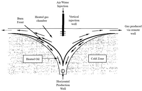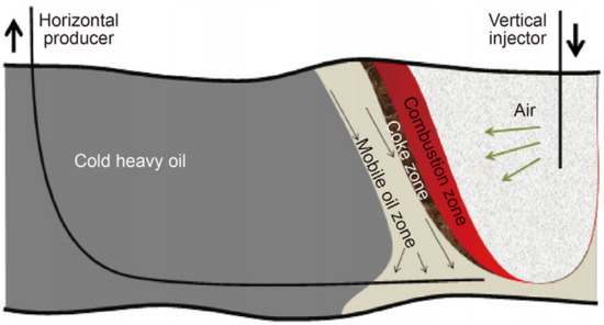 Oxidants like air or oxygen-enriched gas are continuously injected into the reservoir through gas injection wells to sustain the combustion. This contact between the oxidant and the heavy oil fractions results in a heat-generating combustion reaction, creating a “fireline” that moves through the reservoir. As the fireline advances, it heats the crude oil, causing physical and chemical changes like viscosity reduction and breaking down the oil into lighter oils and gases, which are then pushed forward. The heavier components left behind are further broken down into coke, which serves as additional fuel to continue the process, reducing the need for fresh crude oil [25].
