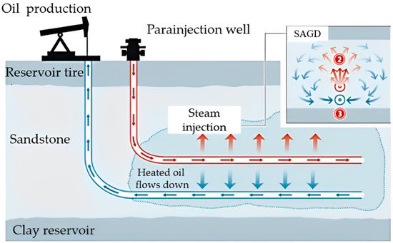 In the middle and late stages of SAGD development, problems such as high water content and pressure reduction in the steam chamber have significant impacts on steam thermal efficiency, and SAGP becomes an effective replacement technology. SAGP is based on SAGD, and it simultaneously injects non-condensable gases such as N2, CO2, and CH4, and it also makes use of non-condensable gases to improve the steam thermal efficiency of SAGD by keeping heat, preserving pressure, and suppressing the steam over-coating, and thus it achieves the purpose of controlling the shape of the steam chamber and maintaining steam pressure, which can further improve the recovery rate of thick oil reservoirs [49,50]. A schematic diagram of the implementation of SAGD technology is shown in Figure 4 [51].