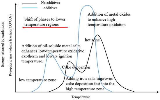 Additives have been proven effective for enhancing the combustion performance of viscous oils and are economically valuable. Various additives are used at different oxidation stages, such as metal salts for low-temperature oxidation acceleration, iron salts for coke deposition improvement, and metal oxides for high-temperature combustion enhancement. The effects of these additives are depicted in Figure 5.