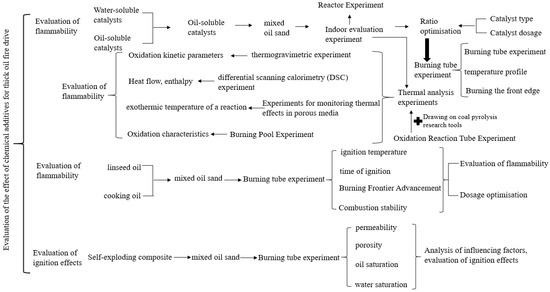 The most promising catalysts for controlling the temperature oxidation process are detailed in various tables from cited studies. Currently, additive evaluation and screening are primarily conducted through indoor experiments, such as TG-DSC, reactors, combustion pools, and other methods to assess the additives’ impact on fire oil layer combustion efficiency and reaction kinetics. A comparison of indoor evaluation methods is shown in Figure 6, where TG, combustion cell, and reactor experiments are used to evaluate additive effects by comparing reaction kinetic parameters.