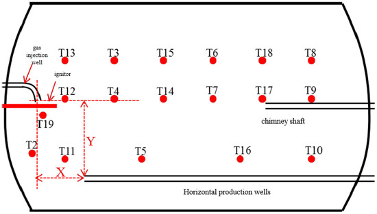 As shown in Table 3, when the thickness of the formation decreases, the expansion of the fire cavity is more influenced by the boundary of the formation, and it is easy to reach a balance between the heat generated by combustion and heat loss, forming a coking zone with a temperature of about 200–300 °C and a thickness of 1–2 cm. The dragging effect of horizontal wells on the development of fire cavity is more obvious, and the thick oil and flue gas subjected to heat and viscosity reduction are produced from the horizontal wells under the dual effects of gravity and injection and extraction differential pressure with faster oxygen breakthrough and shorter expansion distance of the leading edge. When the thickness of the 3D large-size THAI fire physical simulation model is larger, it is easy to achieve better fire-driven effect; when the thickness of the formation is smaller, it is easy to have gas scrambling.