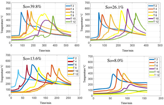 We selected T2, T4, T6, T8, T10 and T12 for the study, and the temperature versus time curves for each group of experiments are shown in Figure 8 and Figure 9 [70].