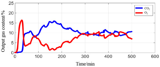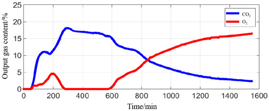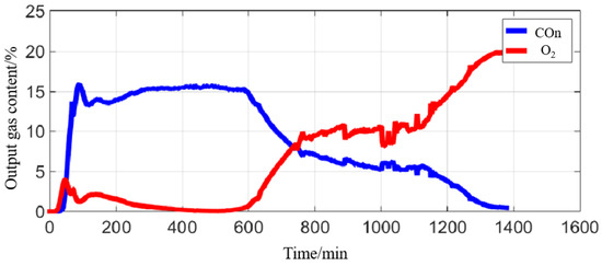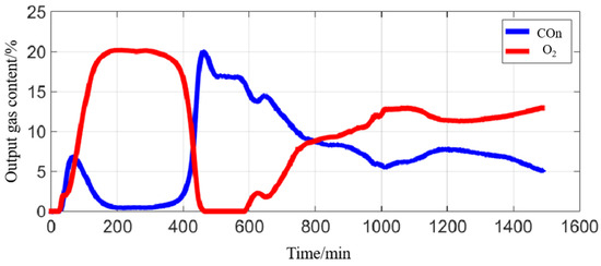 Yalong Zhu’s [70] analysis of experimental data shows that a low injection rate initially results in successful ignition with low oxygen content, but this quickly rises and stabilises around 10%. This indicates high-temperature combustion at the experiment’s start, but due to oxygen scarcity and heat loss, the reaction’s heat output is insufficient to maintain high temperatures, causing the combustion to gradually cease and shift to low-temperature oxidation, as shown in the Figure 10, Figure 11 and Figure 12.