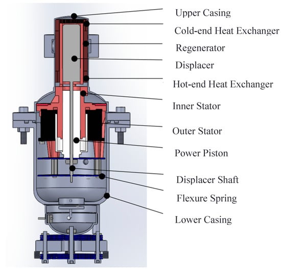 This study focuses specifically on a low-temperature-difference FPSAC. The FPSAC system comprises a linear oscillating motor, displacer, power piston, regenerator, cold-end heat exchanger, and hot-end heat exchanger. The linear oscillating motor drives the reciprocating motion of the power piston, which is coupled to the displacer through gas forces. This coupling enables the completion of the Stirling cycle, facilitating cooling or heating within the working chamber. A three-dimensional diagram of the entire FPSAC model is presented in Figure 1.