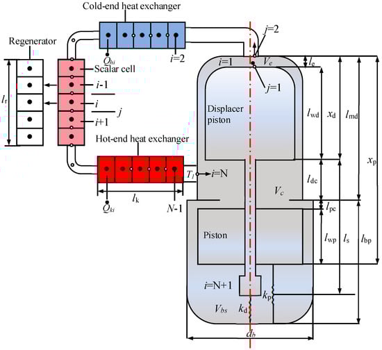 The displacer and power piston are treated as moving rigid bodies, each connected to the engine casing by a single mechanical flexible spring. By applying Newton’s second law and employing Euler integration, the instantaneous relationships for velocity and displacement are derived, which then lead to the motion control equations [45].